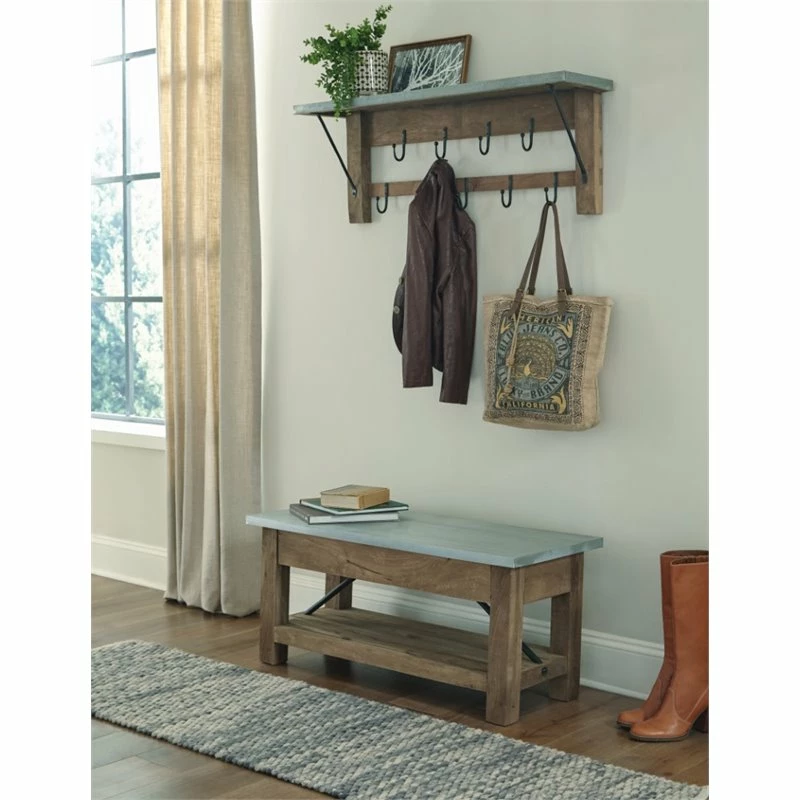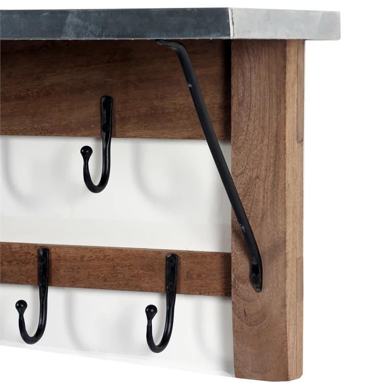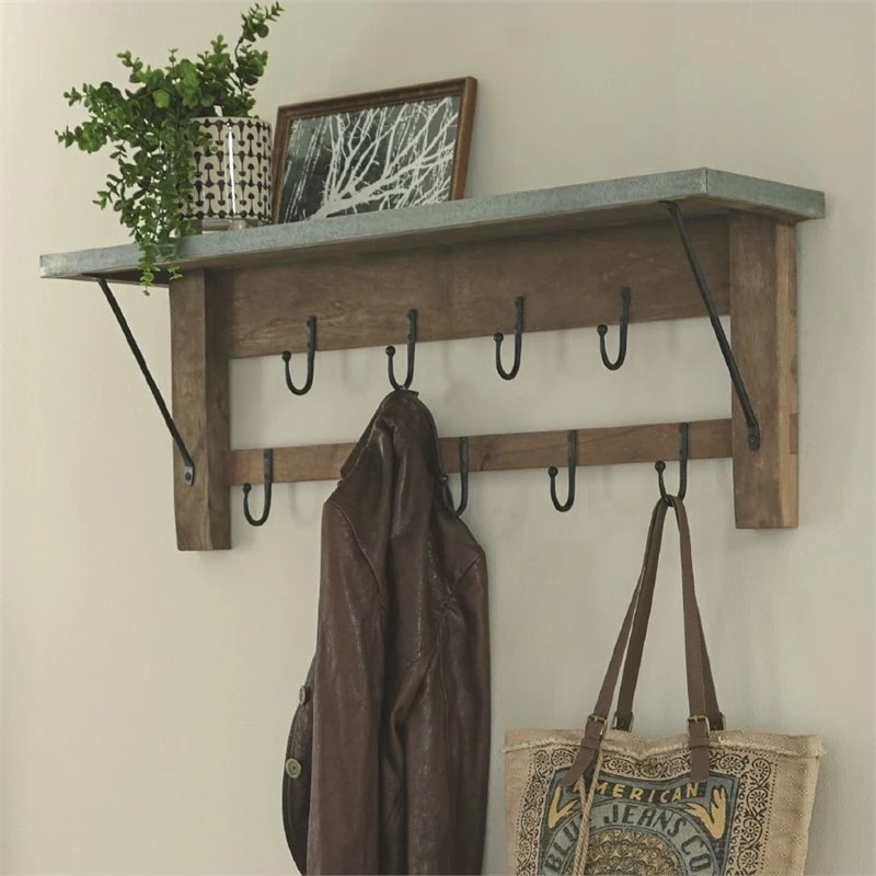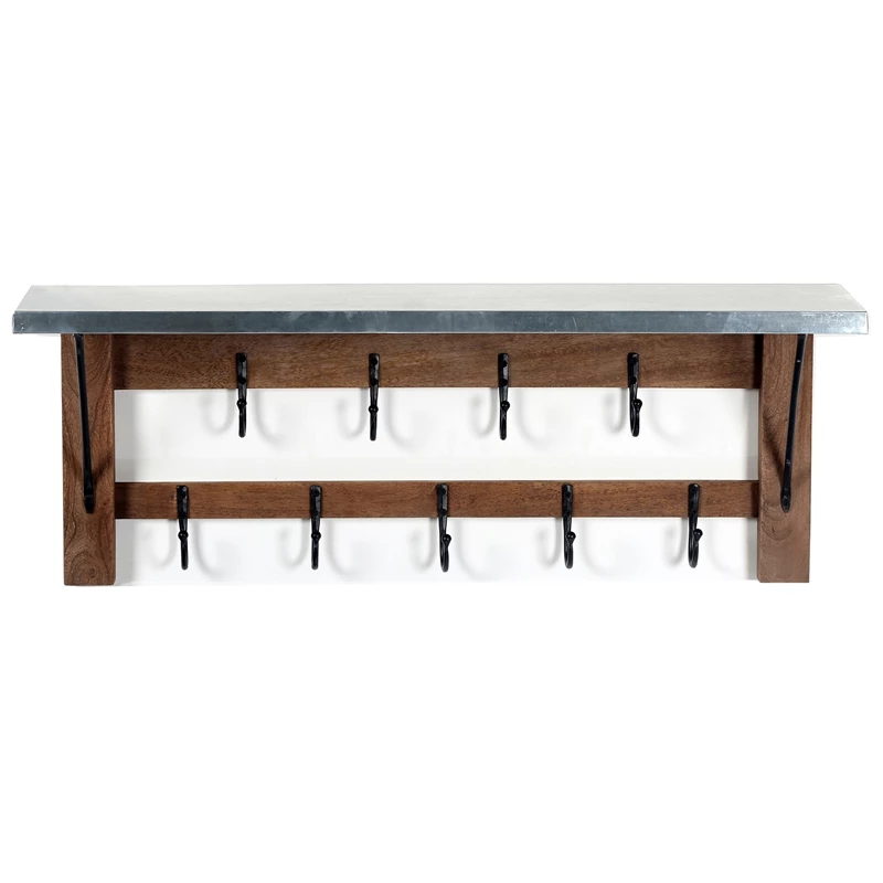 Zinc Metal mixed with Wood and Antique Iron hooks lends Modern Industrial style to your living space. This stunning coat hook offers a balance of sturdy and solid with the lightness of the zinc metal tops; sure to make an impact in your entryway or mudroom. The coat hook features a shelf for additional storage or display space. Nine single metal hooks will keep coats, bags, or other accessories organized.