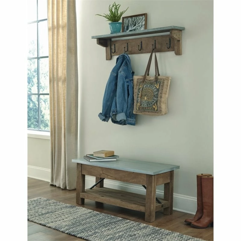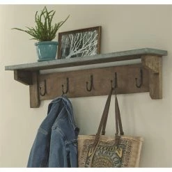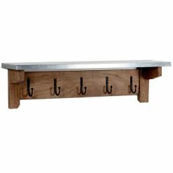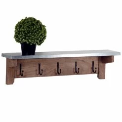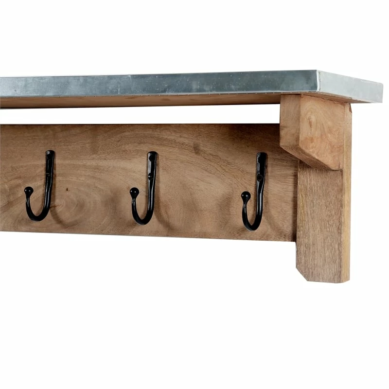 Zinc Metal mixed with Wood and Antique Iron hooks lends Modern Industrial style to your living space. This stunning coat hook offers a balance of sturdy and solid with the lightness of the zinc metal tops; sure to make an impact in your entryway or mudroom. The coat hook features a shelf for additional storage or display space. Five single metal hooks will keep coats, bags, or other accessories organized.