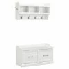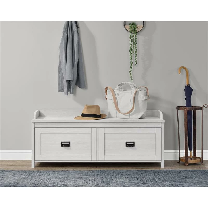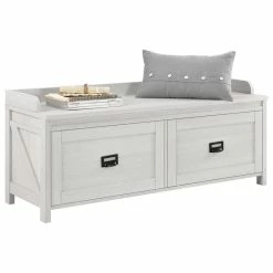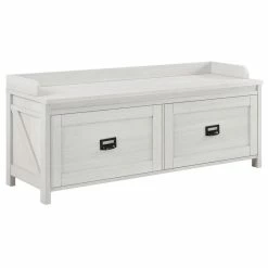 Create an inviting entrance into your home with the SystemBuild Farmington Entryway Storage Bench. The off white woodgrain finish on the laminated particleboard along with the rustic barn style design give the Entryway Storage Bench rustic charm.