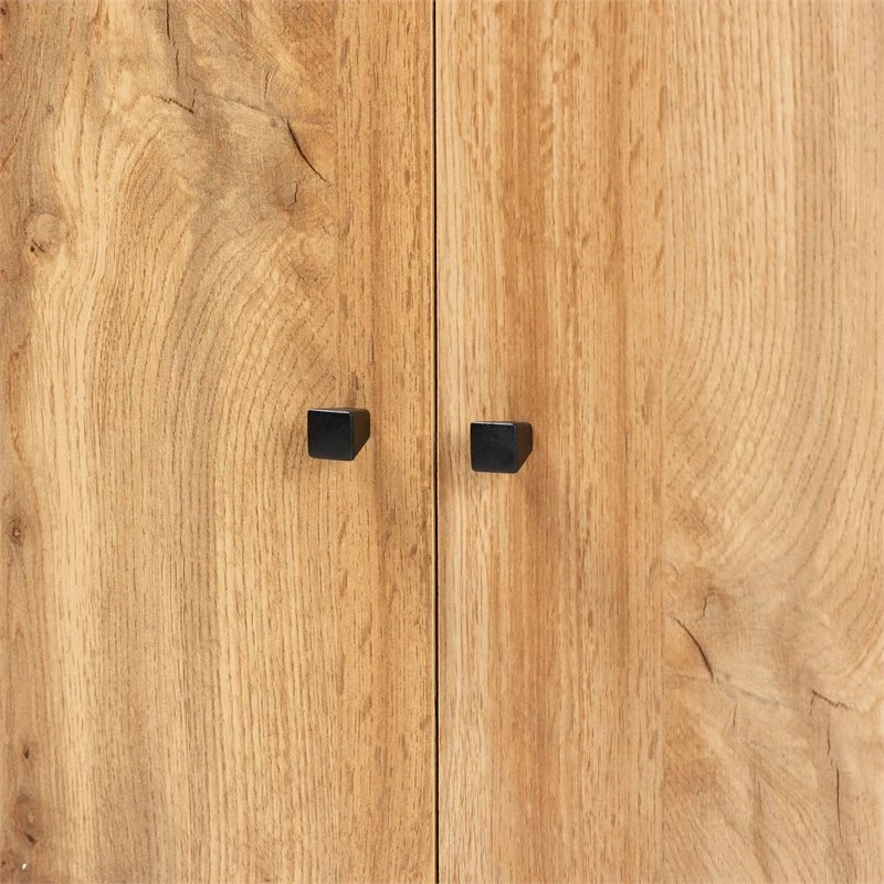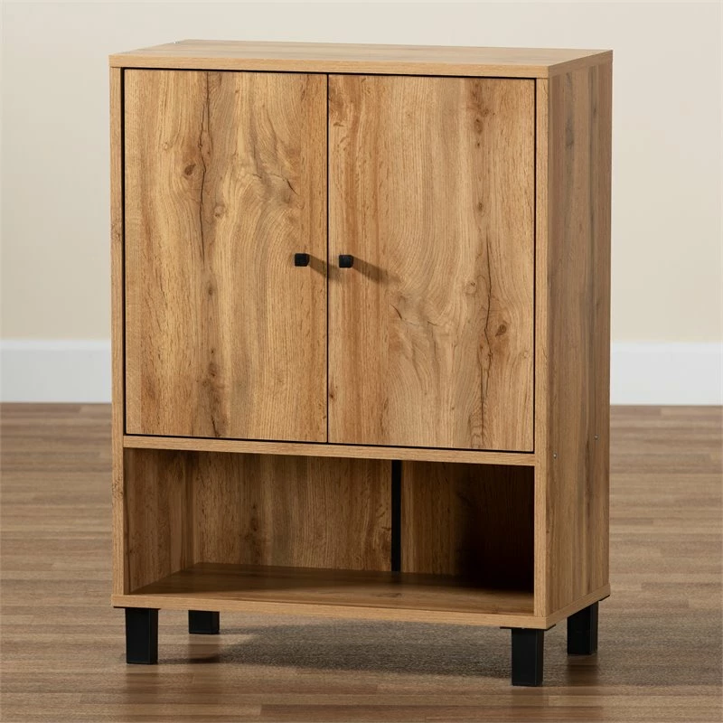 Keep your entryway free of shoe clutter with the Rossin shoe cabinet. Made in Malaysia, the Rossin is comprised of a sturdy wood frame showcasing a warm oak finish. Two doors conceal three shelves with storage space for up to eight pairs of shoes. Additional shoe storage is provided by an open shelf on the bottom of the cabinet. Requiring assembly, the Rossin features circular cut-outs on its back to enable air circulation and prevent mold growth on shoes. Black finished polymer legs and door knobs complete the look, making the Rossin shoe cabinet an excellent addition to the modern home.