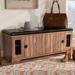 Keep your entryway organized with the Valine Bowery Hill storage bench. Two doors, fitted with black plastic knobs, conceal four shelves with storage space for multiple pairs of shoes. Screen inserts provide ventilation to deter shoe odor buildup. This versatile piece also features a faux leather cushioned seat, providing comfort as you put on and take off your shoes. Constructed from engineered wood, the bench showcases an oak finish that displays the natural grain patterns in the wood, giving the bench a rustic touch. The shoe storage bench is made in Malaysia and requires assembly.