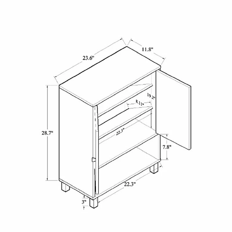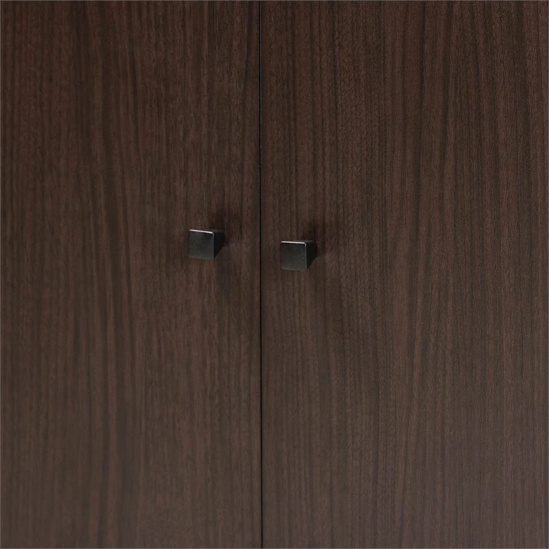 Keep your entryway free of shoe clutter with the Bowery Hill shoe cabinet. Made in Malaysia, the cabinet is comprised of a sturdy wood frame showcasing a rich dark brown finish. Two doors conceal three shelves with storage space for up to eight pairs of shoes. Additional shoe storage is provided by an open shelf on the bottom of the cabinet. Requiring assembly, the cabinet features circular cut-outs on its back to enable air circulation and prevent mold growth on shoes. Black finished polymer legs and door knobs complete the look, making the shoe cabinet an excellent addition to the modern home.