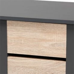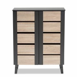 Stylish shoe organization is made easy with the Bowery Hill cabinet. Featuring a clean, contemporary design, this engineered wood cabinet features a chic two-tone oak and dark grey finish. Two doors conceal four shelves with storage space for up to 8 pairs of shoes. Slits are embedded within the doors to enable air circulation and prevent mold growth on your shoes. Angled legs add a cool, mid-century modern touch. The cabinet is made in Malaysia and requires assembly.