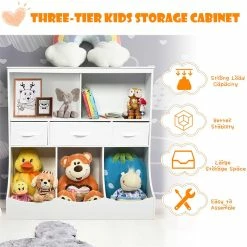 Are you tired of tidying up after the kids? Do you feel upset because of the toys and books are messy? Take a look at our children’s three-tier cabinet! The stylish exterior makes it suitable for any room! Such as children’s room, recreation room or living room. Its structure features two spacious open shelves, three non-woven drawers of different sizes, and three small bins. Shelves can be used to store books, magazines, DVDS, video games, etc. Drawers can be used to hold children’s gloves, clothing and accessories. The bottom three bins are ideal for sorting items, such as craft supplies, dolls and other toys. Also, the top surface provides an extra place for a photo frame or souvenir. This cabinet is made of healthy and environmentally friendly materials, so you don’t have to worry about the negative impact on your health. It’s a great way to stimulate children’s interest and help them learn to sort.