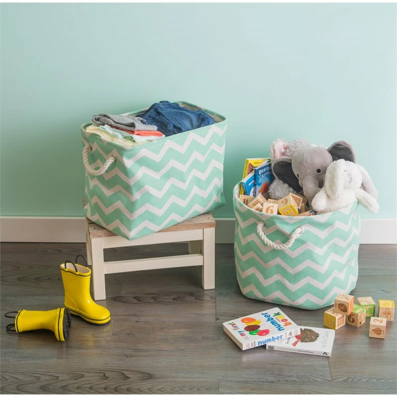 Polyester storage bins are a fun and creative way to organize and store toys, clothes, blankets, towels, books, knick knacks and more. Tired of clutter in the kids room, living room, or laundry room? These storage containers could be the perfect solution to organize the clutter while enhancing your home’s decor. These trendy bins have become very popular due to their simple yet chic look and dependability. Sturdily constructed, these storage bins are up to the task of being carried to-and-fro, used to transport groceries, laundry, or household goods these bins will handle it. The material and construction offers a long lasting bin that you can use over and over again.
