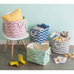 Polyester storage bins are a fun and creative way to organize and store toys, clothes, blankets, towels, books, knick knacks and more. Tired of clutter in the kids room, living room, or laundry room? These storage containers could be the perfect solution to organize the clutter while enhancing your home’s decor. These trendy bins have become very popular due to their simple yet chic look and dependability. Sturdily constructed, these storage bins are up to the task of being carried to-and-fro, used to transport groceries, laundry, or household goods these bins will handle it. The material and construction offers a long lasting bin that you can use over and over again.