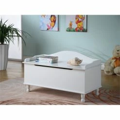Beautifully designed storage bench in a white finish. Double function storage toy bench with locking hinged top. Lift bench seat for storage.