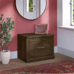 The kathy ireland® Home by Bush Furniture Woodland 24W Small Shoe Bench with Drawer combines transitional styling and a practical design to offer an ideal entryway organizer. Have a seat on the durable bench and take a moment to relax as you get ready to head out the door or come home after a long day. The top of the mudroom bench supports 250 pounds, so you can sit down to put on and take off your shoes or set shopping bags down after a trip to the store with confidence. A small drawer opens on smooth full-extension ball bearing slides for easy access to footwear. The storage bench’s transitional design blends elements of contemporary and traditional styling to complement a wide range of home furnishings. This small entryway bench with storage has been tested to meet Bush Furniture’s standards for safety, performance and durability and is backed by a 3 Year Manufacturer’s Warranty. Materials: Engineered wood and Laminates