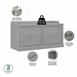 The kathy ireland® Home by Bush Furniture Woodland 40W Shoe Storage Bench with Doors combines transitional styling and a practical design to offer an ideal entryway organizer. Have a seat on the durable bench surface and take a moment to relax as you get ready to head out the door or come home after a long day. The top of the mudroom bench supports up to 250 pounds, so you can sit down to put on and take off your shoes or set shopping bags down after a trip to the store with confidence. Cabinet doors conceal two compartments that keep footwear in order and out of sight. The shoe bench’s transitional design blends elements of contemporary and traditional styling to complement an array of home furnishings. This entryway bench with storage has been rigorously tested to meet Bush Furniture’s standards for safety, performance and durability and is backed by a 3 Year Manufacturer’s Warranty. Materials: Engineered wood and Laminates
