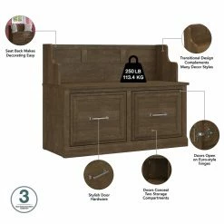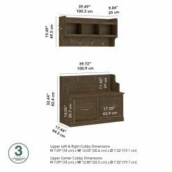 The kathy ireland® Home by Bush Furniture Woodland 40W Entryway Bench with Doors and Wall Mounted Coat Rack combines transitional styling and a practical design for an ideal storage solution. Have a seat on the shoe bench and take a moment to relax as you get ready to head out the door or come home after a long day. The mudroom bench supports 250 pounds, so you can sit down to put on and take off your shoes or set shopping bags down after a trip to the store with confidence. Cabinet doors conceal two internal compartments that keep footwear in order and out of sight. The wall shelf includes six coat hooks for hanging jackets, hats and scarves. Smaller items like gloves and keys can be stashed neatly inside three open cubby spaces. This Entryway Bench and Coat Rack has been tested to meet Bush Furniture’s standards for safety, performance and durability and is backed by a 3 Year Warranty. Materials: Engineered wood and Laminates