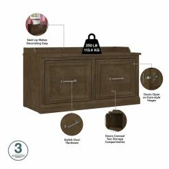 The kathy ireland® Home by Bush Furniture Woodland 40W Shoe Storage Bench with Doors and Wall Mounted Coat Rack combines transitional styling and a practical design to offer an ideal entryway organizer. Have a seat on the bench and take a moment to relax as you get ready to head out the door or come home after a long day. The top of the mudroom bench supports 250 pounds, so you can sit down to put on and take off your shoes or set shopping bags down after a trip to the store with confidence. Cabinet doors conceal two internal compartments that keep footwear in order and out of sight. The wall shelf includes six coat hooks for hanging jackets, hats and scarves. Smaller items can be stashed neatly inside three open cubby spaces. This entryway bench and coat rack has been tested to meet Bush Furniture’s standards for safety, performance and durability and is backed by a 3 Year Warranty. Materials: Engineered wood and Laminates