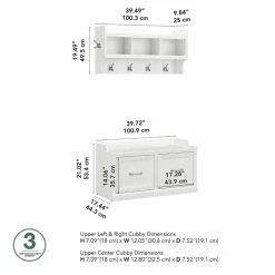 The kathy ireland® Home by Bush Furniture Woodland 40W Shoe Storage Bench with Doors and Wall Mounted Coat Rack combines transitional styling and a practical design to offer an ideal entryway organizer. Have a seat on the bench and take a moment to relax as you get ready to head out the door or come home after a long day. The top of the mudroom bench supports 250 pounds, so you can sit down to put on and take off your shoes or set shopping bags down after a trip to the store with confidence. Cabinet doors conceal two internal compartments that keep footwear in order and out of sight. The wall shelf includes six coat hooks for hanging jackets, hats and scarves. Smaller items can be stashed neatly inside three open cubby spaces. This entryway bench and coat rack has been tested to meet Bush Furniture’s standards for safety, performance and durability and is backed by a 3 Year Warranty. Materials: Engineered wood and Laminates