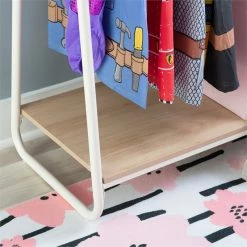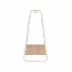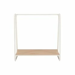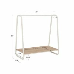 Introduce a new level of tasteful organization to your bedroom or children’s room with this clothing rack. The short profile measures at 35” L x 17.5” D x 36” H, and is perfect for hanging shirts and other garments at an easy to reach height. A curved white metal frame supports an open wooden shelf in a natural finish that is perfect for storing folded laundry, shoes or bags. Simple assembly and functional style are moments away.