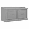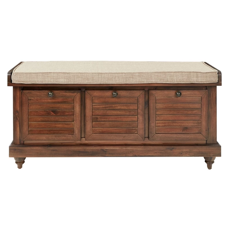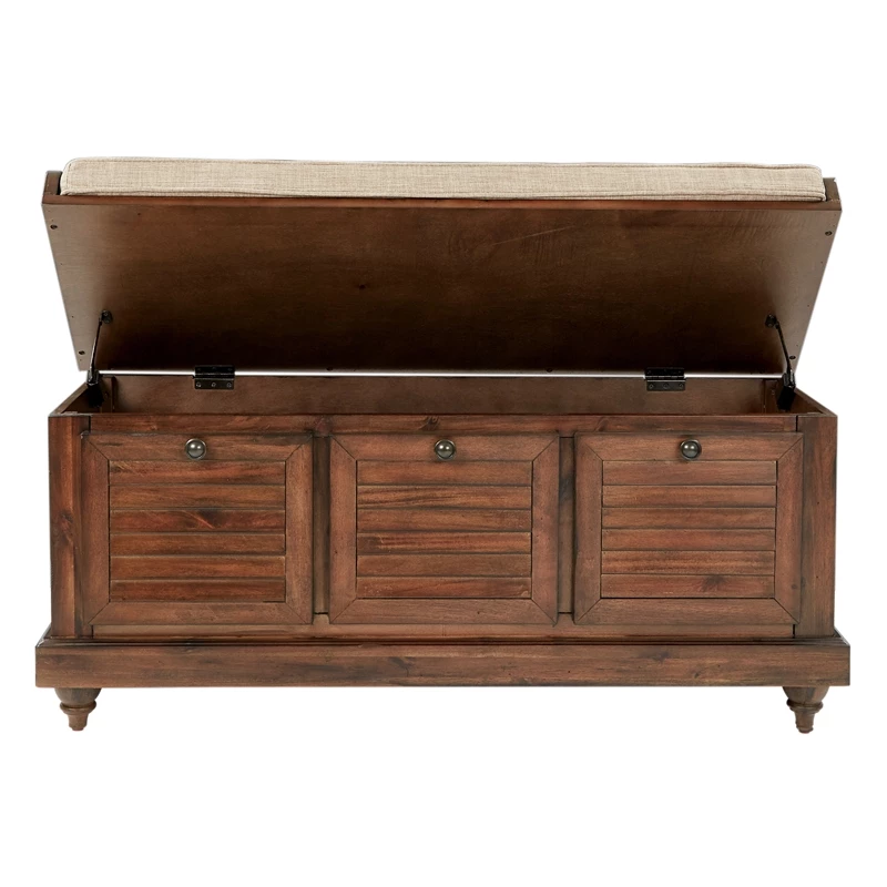 Dover Storage Bench in Distressed Brown Fully Assembled Emanate a coastal cool vibe in your home with this chic wood storage bench. The perfect addition to the front entry, stairway alcove, or mudroom. A beautiful weathered finish is accompanied by a louvered front with decorative hardware accents. Benchtop lifts to reveal a generous storage area for blankets, pillows, or any other items you need to tuck away for easy access. Get the stylish extra storage space you need with the OSP Designs Dover storage bench.
