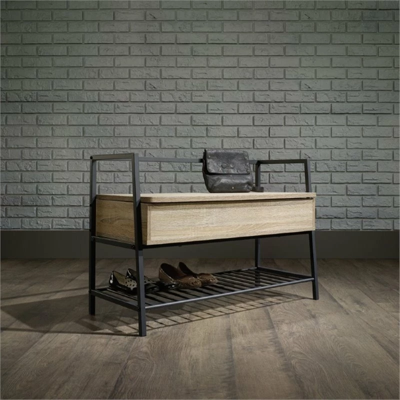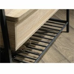 This handy bench features a spacious seat, making it the perfect spot to tie your shoes in the morning, kick your boots off at night or for an extra spot for guests to sit back and relax. The seat flips up to reveal a hidden storage area that includes a divider for you to organize and store anything from books and blankets to jackets and handbags. It has room for all your miscellaneous items. It also features a lid stay for safety. The lower grate-styled shelf provides you with additional storage space that is ideal for shoes or easy-access storage for just about anything. Its simple design and industrial charm make this bench a great fit in any room of your home – the living room, entryway, bedroom or hallway.