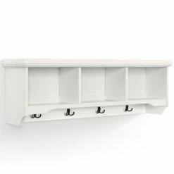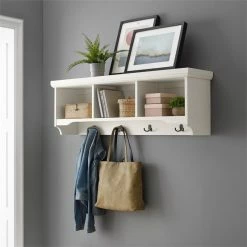You’ll be ready to hang your hat when you come home to this storage shelf in your entryway. This wall mounted storage shelf makes a great companion to an entryway bench or console table and blends well with traditional and cottage décor. The beautiful distressed white finish and beadboard accents bring an upscale coastal vibe to the three storage cubbies and four double prong hooks, making home organization fashionable and functional.