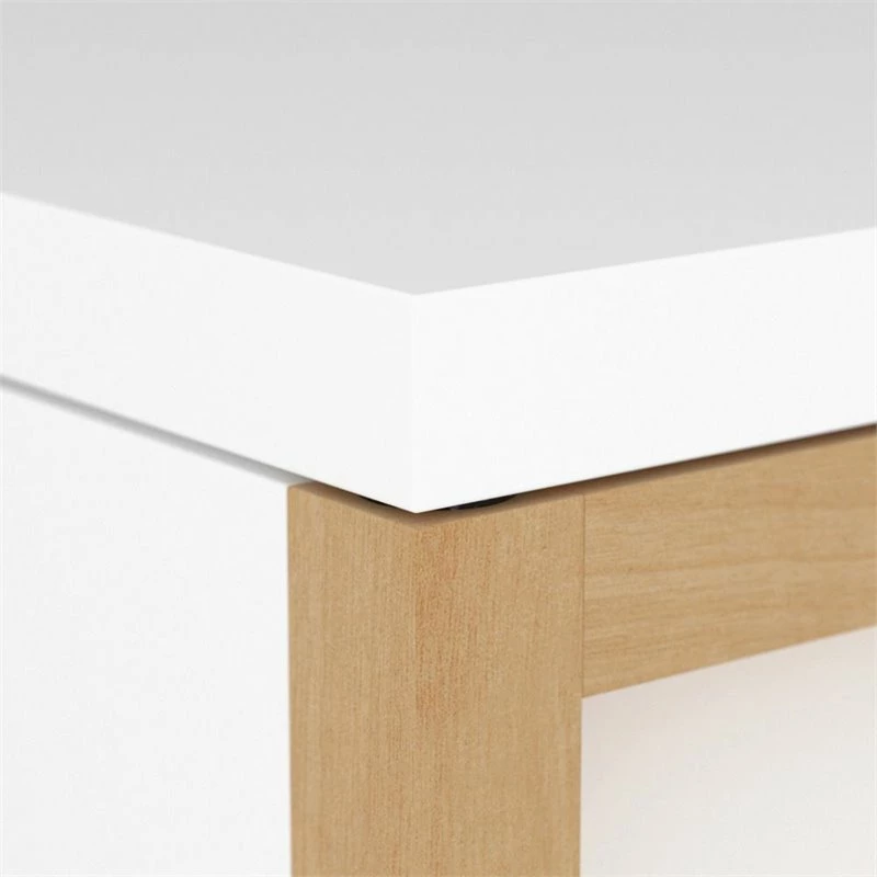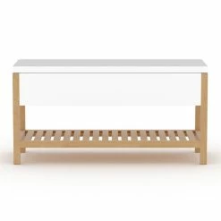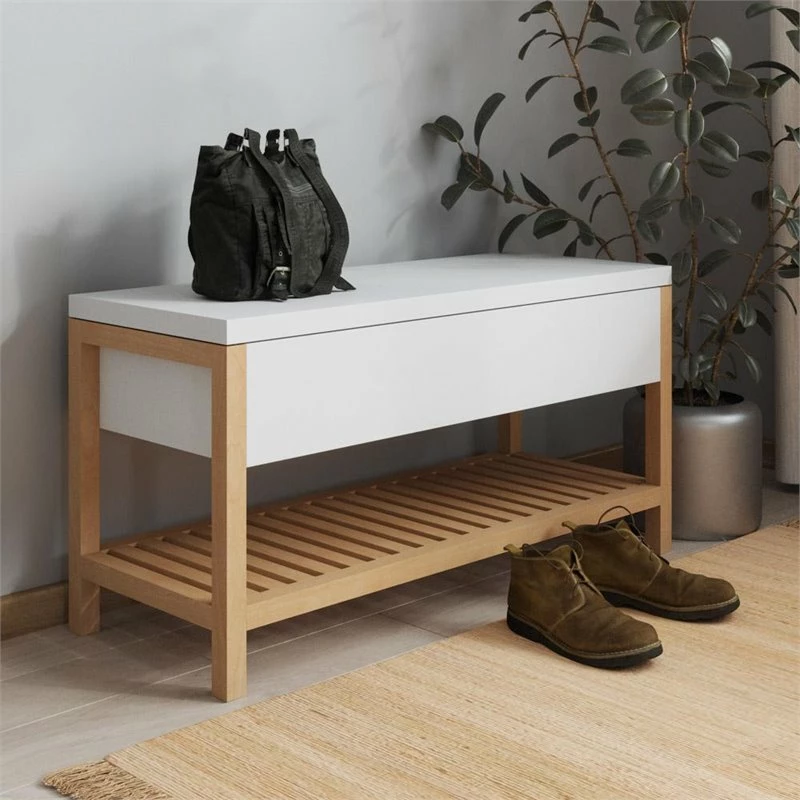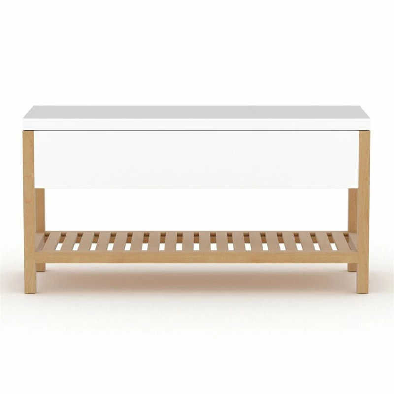 A light, fresh radiance follows modern style and minimalist design principles, making this storage bench a great find. Send clutter packing with a piece custom designed for use in bedrooms or entryways, picking up the slack and creating essential space for shoes, coats, and other closet-related accessories. A bright white finish coats a storage trunk nestled in a frame and slatted lower shelf fashioned of natural finish composite wood. Brighten and organize in one easy step.