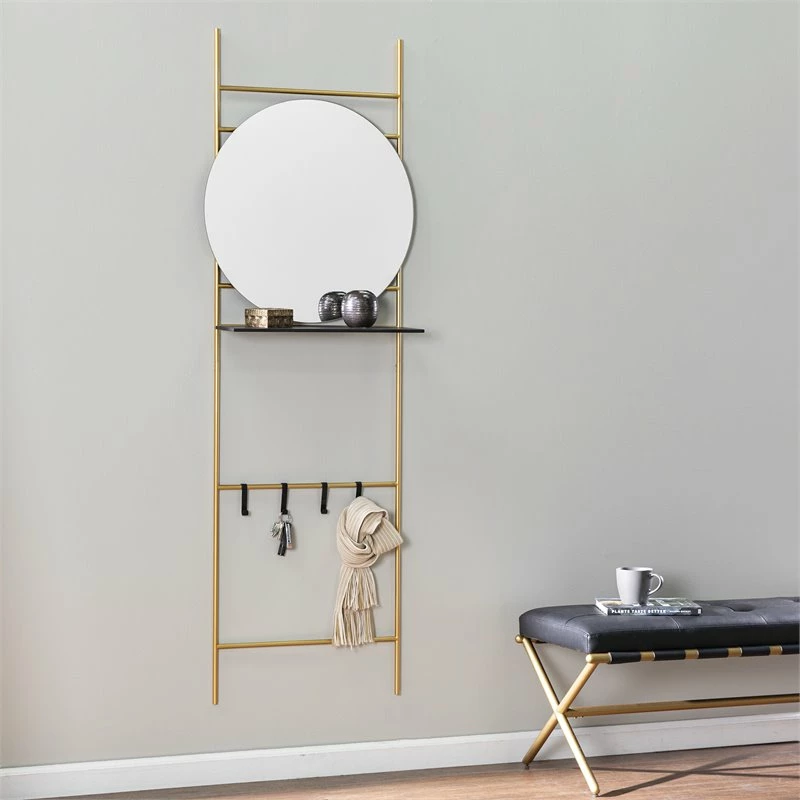 Lean into function with this modern hall organizer. An open shelf holds keys, cell phones, and wallets while the mirror lets you check your outfit before heading out the door. Four hooks hold scarves and small bags, keeping your entryway tidy. Check organization off your list when you place this contemporary entry tree by your front door.