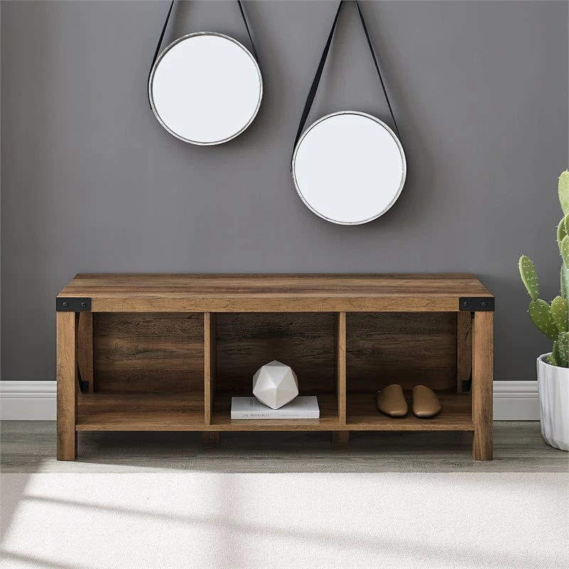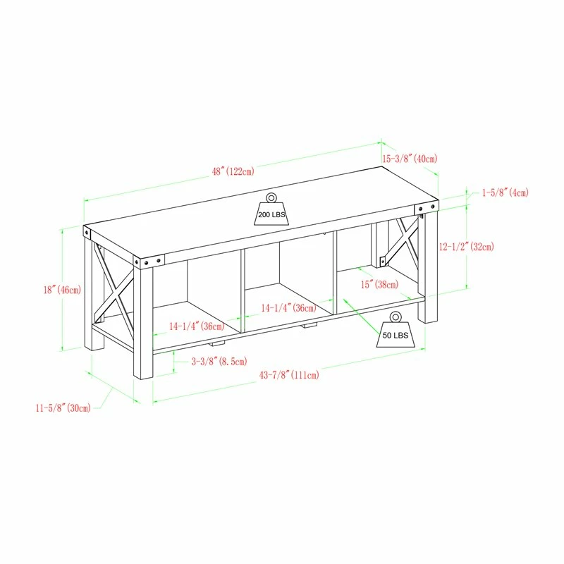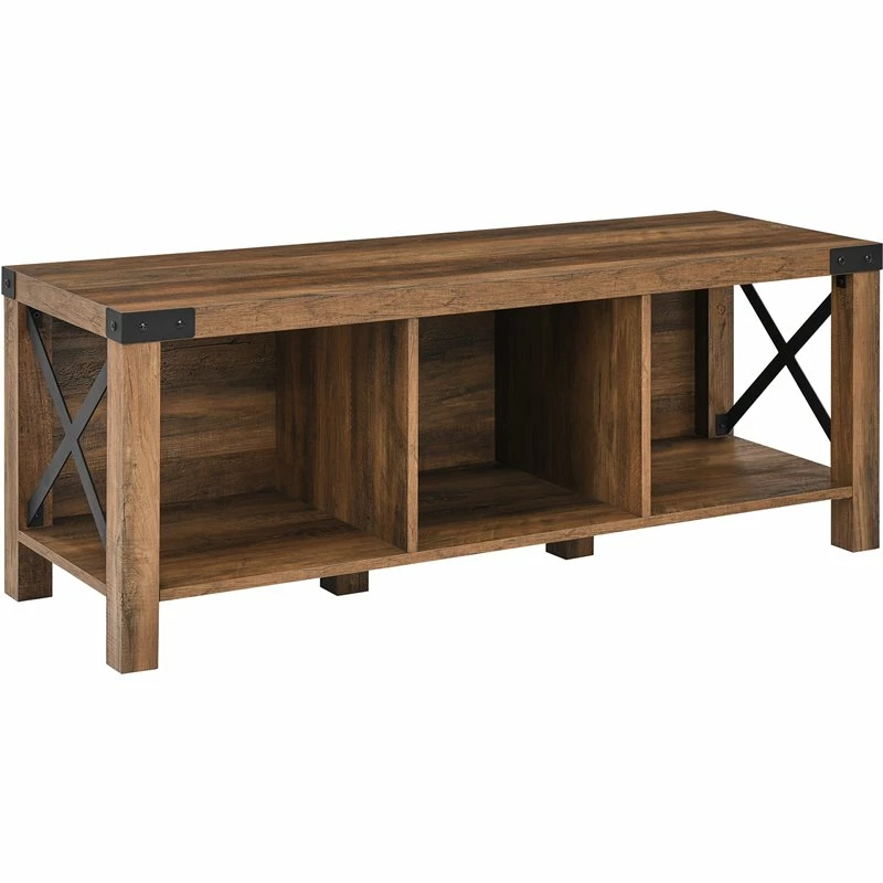 Usher in this storage friendly farmhouse bench into any number of places in your home. It’s a great addition in the entryway, at the foot of a bed, or in your living room because it provides extra seating and accommodates space saving needs. The three cubbies fit most standard size bins. The charm of this bench continues with its metal accents. With riveted angle details on the top corners and black metal X’s on the sides, you’ll get a rustic feel that transforms this bench into so much more than mere wood and metal.