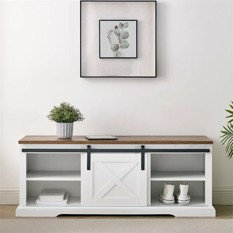 Add a new treasure to your entryway with this farmhouse storage bench. The sliding X barn door travels on an exposed metal track that caters to your rustic style. Two adjustable shelves and one fixed shelf are each perched inside their own storage compartments, so you can have separate spots for all your outdoor gear. Lace up or kick off your shoes while you rest on the bench seat, assured that the sturdy MDF wood structure will be there to support you.
