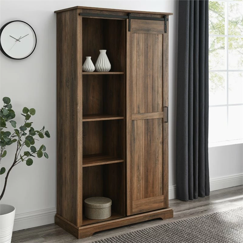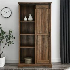 Get your hallway together with this vertical farmhouse storage cabinet. The grooved door front and rustic hardware offer a country-inspired look your whole family can enjoy. Place backpacks, hats, coats, or lunchboxes on the two fixed shelves and four adjustable shelves for an organized feel in your entryway or mudroom. The sliding door offers customizable organization as it moves smoothly on the metal track. Choose from three beautiful finishes to match your rural taste.