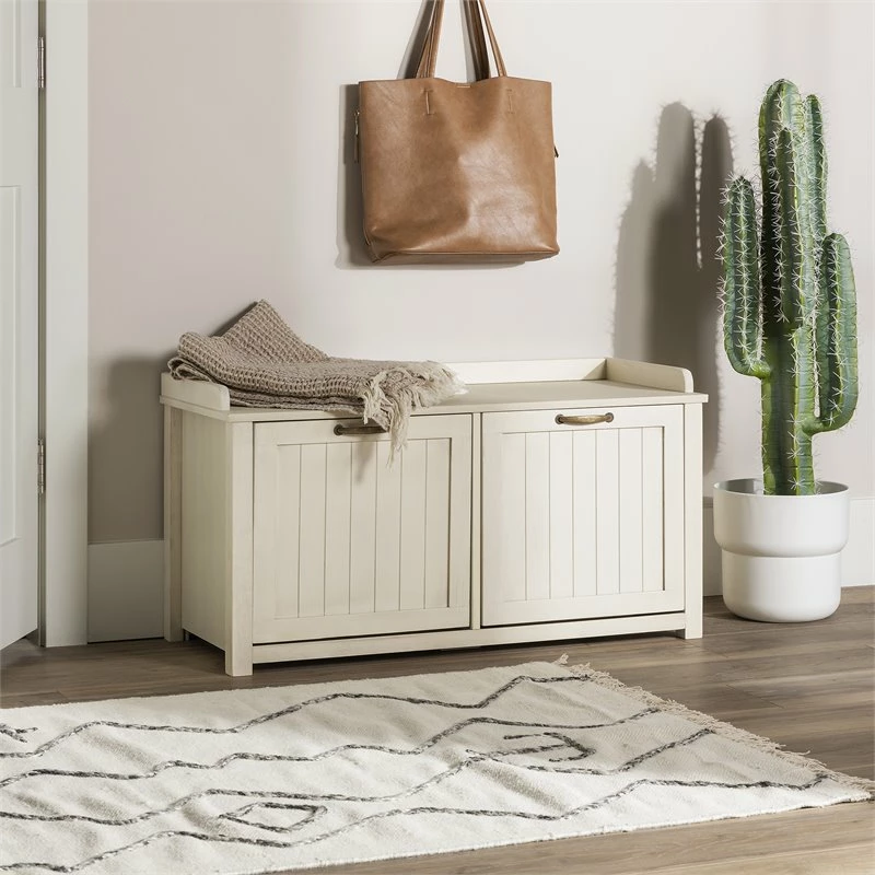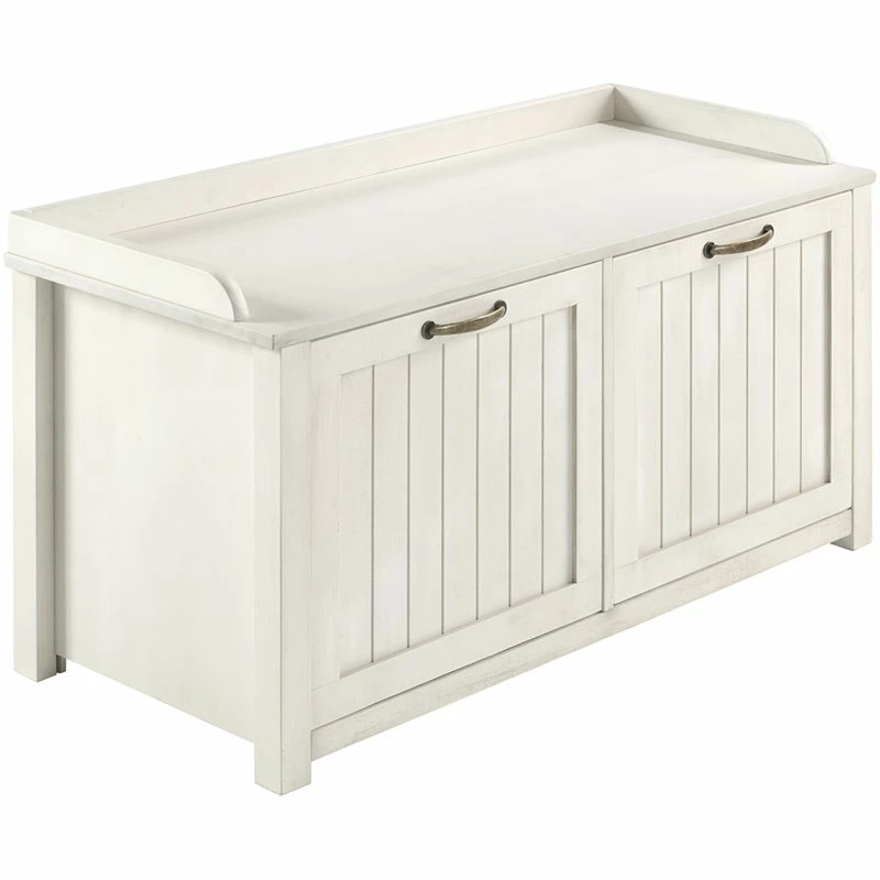 Create the warmest welcome home with this storage-savvy entry bench. Its grooved door detail and metal accents bring with them farmhouse-inspired personality and a place for everything from snowy boots to summer beach towels. One hinged door and a single shelf are prime places for extra linens, grab-and-go lunchboxes, or entryway essentials. A drop down pullout door reveals a space ideal for shoe storage, so your mudroom can stay clear of stray cleats and wandering flip flops. Its cushion-friendly, tray top design and responsibly sourced solid pine wood construction ensures the coziest hellos and goodbyes as soon as you walk through the door.