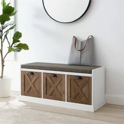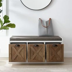 Get that cozy, country vibe on with this modern farmhouse storage bench. Kick off your shoes and relax on the comfortable, plush cushion as soon as you walk in the door when this piece is placed in your entryway or mudroom. Tuck backpacks, coats, and pet accessories out of sight within the three, deep drawers. Barndoor fronts and cup handles will disguise your need for storage with a rural taste that all will enjoy. Made with warp resistant MDF and durable laminate, this sturdy entry bench has the strength to hold whatever life throws your way.