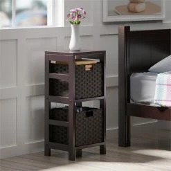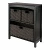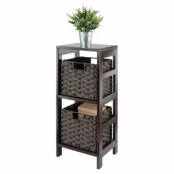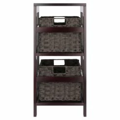 Combine extra storage space with the convenience of the versatile Winsome Wood Leo 3-Piece Storage Shelf Set. Great compact shelf that includes 2 foldable baskets to help keep any room tidy. Keep seasonal accessories handy in the closet, organize toys in the kids’ room, or use as a standalone bookcase in the family or living room. Finished in a rich espresso and made of solid wood for long-lasting durability. The set of baskets are woven in durable flat polypropylene in a chocolate finish and have two cut out handles, one on each end, for carrying purposes. Prompt up and these baskets measure 10.24”W x 11.02”D bringing charm and style. When not in use, they fold for easy storage taking up almost no space. This set is shipped in two boxes. The shelf will ship separately and will include the hardware necessary for assembly. Replacement parts can be requested directly to the manufacturer within 60 days from date of purchase.