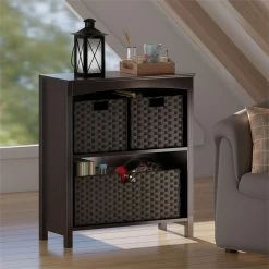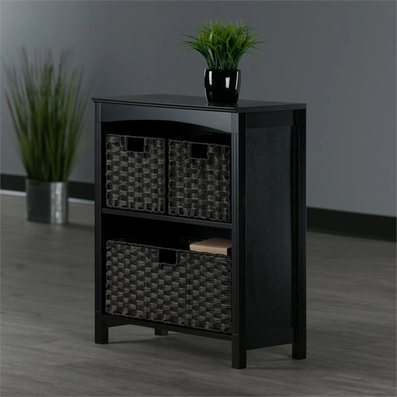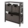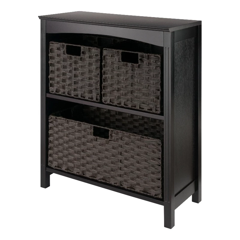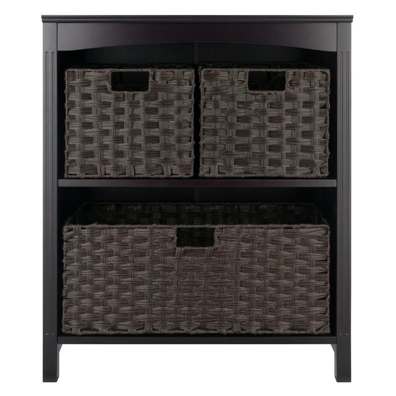 Enhance the appearance of any room with the simple yet attractive design of the Winsome Wood Terrace 4-Piece Storage Shelf Set. Spacious shelf perfect as a standalone bookcase in the home office or displaying family portraits and treasures in the living room. Finished in a rich espresso and made of solid and composite wood for long-lasting durability. The set of baskets are woven in durable flat polypropylene in a chocolate finish and have two cut out handles, one on each end, for carrying purposes. Two small baskets that are 10.24”W x 11.02”D and one wide that is 10.24”W x 11.02”D, bring charm and style to this set. They are great for decorative storage and organization. Or fold up for compact storage taking up almost no space. So, whether you need it in the mud room for shoes, laundry room for the towels and detergents, or as a display shelf in the living room, this 2-section shelf offers stylish organization for all your essentials. This set is shipped in two boxes. The shelf will ship separately and will include the hardware necessary for assembly. Replacement parts can be requested directly to the manufacturer within 60 days from date of purchase.